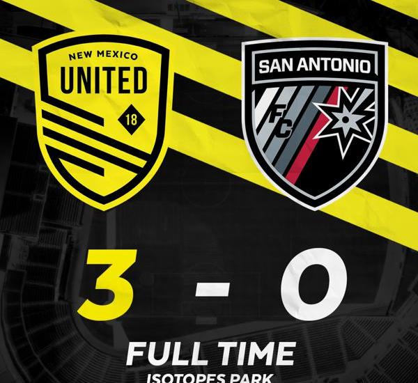 (ALBUQUERQUE, New Mexico) New Mexico United now sits alone atop the USL Championship Western Conference standings, as they defeated San Antonio FC, 3:0 at Isotopes Park. Devon Sandoval drew first blood, and Chris Wehan added a brace as United roared to victory in front of 15,023 fans.