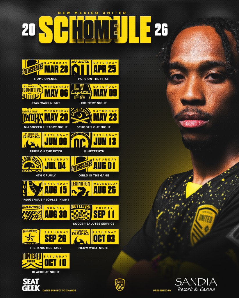 The season kicks off with the Home Opener on Saturday, March 28, when New Mexico United hosts Colorado Springs Switchbacks FC at Rio Grande Credit Union Field, setting the stage for another electric year in Albuquerque. Fans can then enjoy one of the most popular annual traditions, Pups on the Pitch, on Saturday, April 25, when four-legged supporters are welcomed to the stadium.